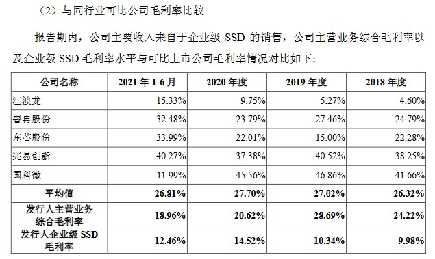因采取竞争性价格策略,公司核心产品SSD价格三年来降价幅度超过60%,2021年上半年,忆恒创源主营业务的综合毛利率18.96%,远比同业可比公司的平均值要低。