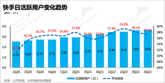 平台日活达到3.66亿,同比增长13%,用户粘性(DAU/MAU)季节性回落到57%,但与社交平台同行对比,仍然处于相对较高的水平,也接近快手对自己的中长期目标60%。