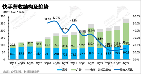 但与同行相比,这个表现实际一般般,体现了部分商家对快手的认可度还不高。在经济回暖复苏的今年,商家手头预算宽裕后,会有更多的额外预算分配到品牌广告上,但这恰恰在快手身上并不占优势,可能体现为今年的外循环广告增速仍然跑输同行。