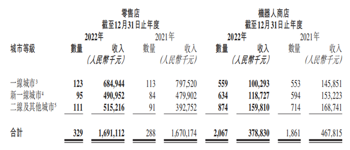 机器人商店收入从4.67亿元下滑至3.78亿元,同比下滑19%。机器人商店新增206家,截至2022年共有2067家。疫情期间,有627家机器人商店关门一周至三个月。