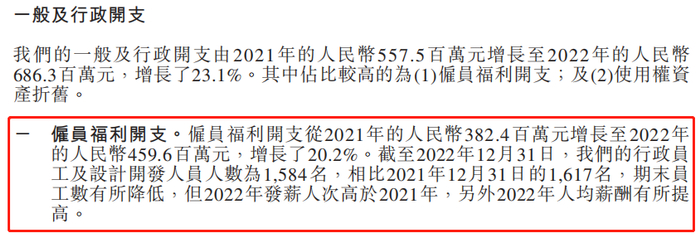同样,一般及行政开支,显示雇员福利开支由3.82亿元增长至4.59亿元,增长了20%。而人工数量从2021年的1617人减少至1584人。