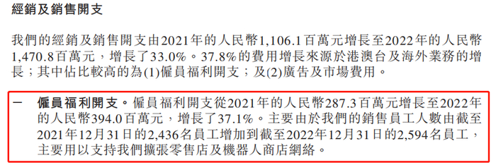 财报中的经销及销售开支显示。雇员福利开支由2021年的2.87亿元增长至3.94亿元,增长了37%。对应着的是销售员工由2436人增长至2594人。