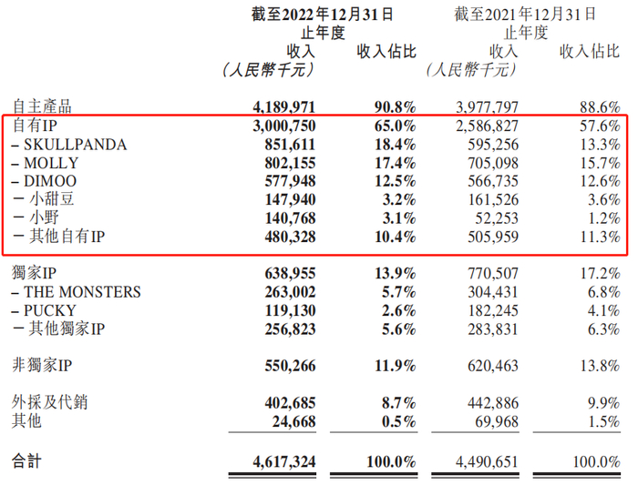 从下图中看,Skullpanda已成营收最多的IP,占营收的18.4%。Molly排在第二,占17.4%,较2021年也有所增长,这意味着Molly大手办市场也受欢迎。