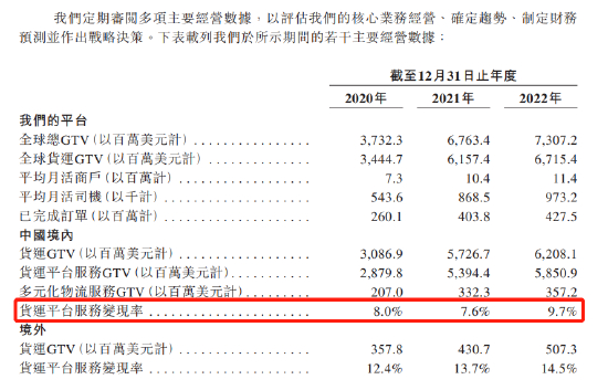 首次盈利背后,业绩依赖提高司机抽佣率。根据公司经营数据,货拉拉全球货运GTV从2020年34.45亿美元提升至2021年的61.57亿美元,并进一步提升至2022年的67.15亿美元,中国境内货运平台服务GTV则分别为28.8亿美元、53.94亿美元以及58.51亿美元,相应的货运平台变现率也从2020年、2021年的8%左右,大幅提升至2022年的9.7%。