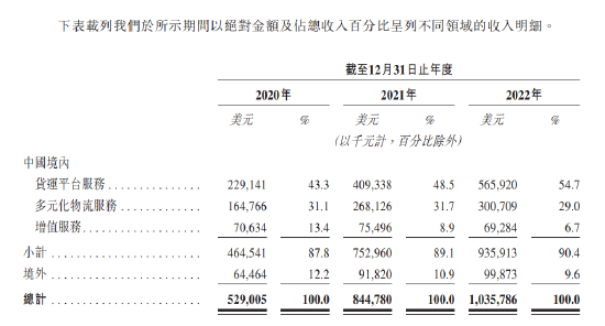 财报显示,公司主要收入来源于境内,营收占比目前超过90%,而境外收入占比不断下滑,2022年已不足10%。其中,境内业务主要包括货运平台服务、多元化物流服务以及增值服务。