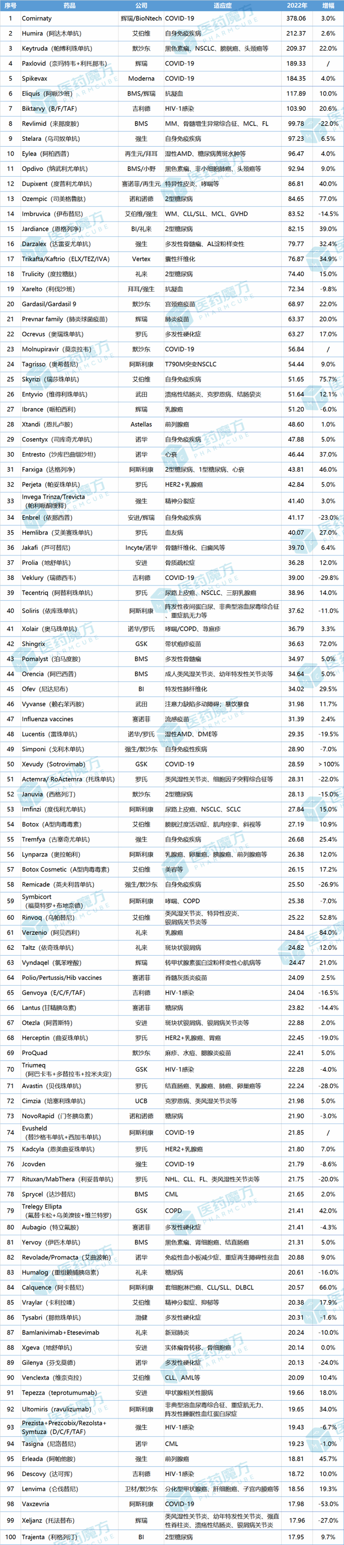 随着全球新冠疫情逐步走向平稳,新冠产品类营收增速明显乏力,百亿美元的销量高光时刻或将消逝。失去新冠红利的加持,2023年全球药品销售额TOP100榜单将会发生怎样变动,非常值得期待。