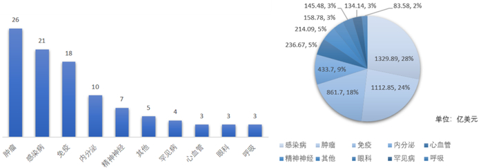 TOP100药品中肿瘤、感染病、免疫、内分泌、心血管是市场规模最大的5个领域,均超过了200亿美元。市场规模越大,竞争就越激烈,肿瘤与自免领域竞争激烈程度不必赘述,一年一度的TOP10药企榜单排位顺序变动尽显无遗。