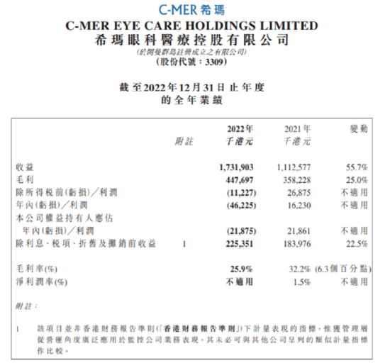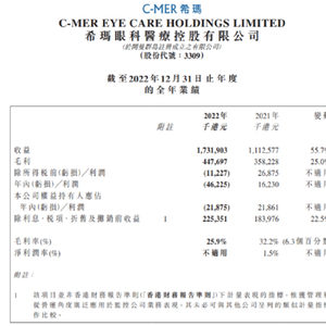 近期,希玛眼科公布2022年年度业绩,2022年该公司实现收益总额为17.3亿港元,同比增长55.7%。扣除疫情相关医疗耗材收入后,核心医疗业务收益按年上升28.9%至14.3亿港元。股东应占亏损为2190万港元,扣除非现金项目,调整后股东应占利润为1137万港元。