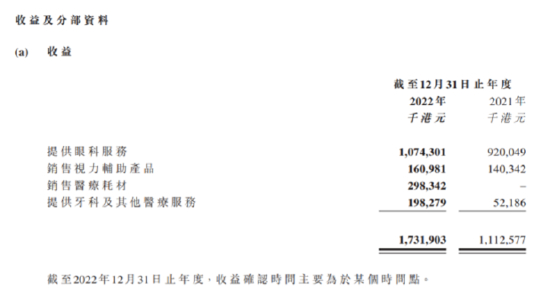 2022年年报显示,眼科服务实现收入10.74亿元,占到公司总营收的62%;销售医疗耗材实现收入2.98亿元,去年同期为零;销售视力辅助产品1.61亿元,提供牙科及其他医疗服务实现收入1.98亿元。