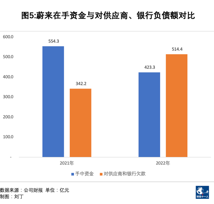 2020年和2021年,蔚来的资金多于供应商欠款及银行和投资者欠款总额,但2022年底,已经产生缺口。截至2022年底,蔚来在手资金与供应商欠款以及银行和投资者欠款之间的缺口达到59.4亿元,相比起来,理想汽车是超出305亿元,小鹏汽车超出197.13亿元。
