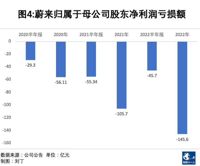 2020年到2021年蔚来的亏损在全年呈现平均分布的态势,半年报的亏损额度,大概相当于全年亏损的一半。2020年上半年亏损29.3亿元,全年亏损56.1亿元,2021年上半年亏损55.3亿元,全年亏损为105.7亿元。但2022年,蔚来上半年亏损45.7亿元,全年亏损却大幅飙升到145.6亿元,是半年报的3倍。加速扩大的亏损趋势需要高度警惕。