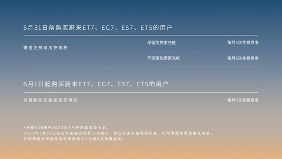 在2023年5月31日前支付定金购买上述车型,及2023年7月31日前支付定金购买全新ES8车型的用户,首任车主权益保持不变,仍按照是否安装免费充电桩享受每月4次或6次免费换电。