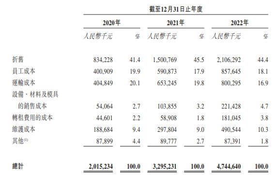 2020-2022年,宏信建设的销售成本分别为20.15亿元、32.95亿元、47.45亿元,变动趋势同收入保持一致。其中, 折旧费用分别为8.34亿元、15.01亿元、21.06亿元,占总的销售成本的比重分别为41.4%、45.5%、44.4%。