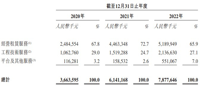 拆分收入结构来看,宏信建设的收入来源于经营租赁服务、工程技术服务、平台及其他服务三大板块。报告期内,经营租赁服务板块实现收入24.85亿元、44.63亿元、51.9亿元,收入占比分别为67.8%、72.7%、65.9%,呈稳步上升态势。