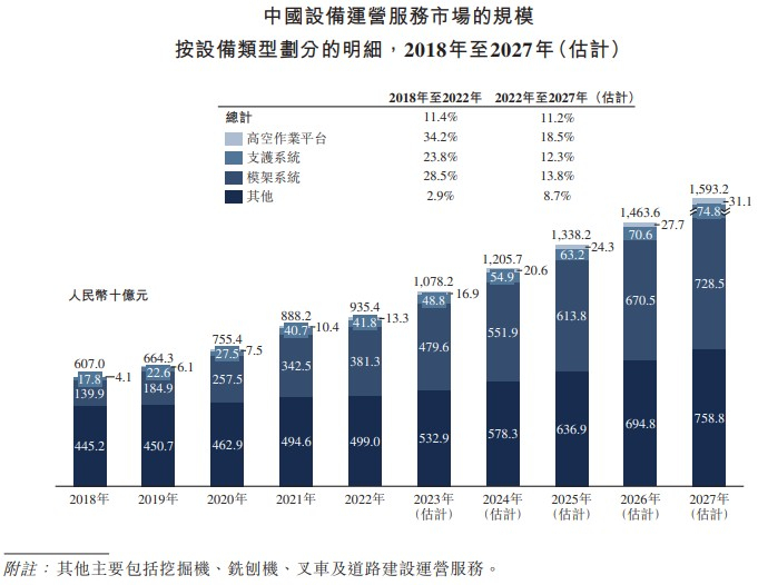 行业视角而言,过去几年间中国设备运营服务市场保持着高速增长的态势。细分市场来看,2018-2022年高空作业平台、支护系统、模架系统的复合年增长率分别达到了34.2%、23.8%、28.5%,均以双位数增长。另据弗若斯特沙利文的资料,2022-2027年间,上述行业的潜在复合年增长率分别将达到18.5%、12.3%、13.8%,增速有所放缓但仍较为可观。