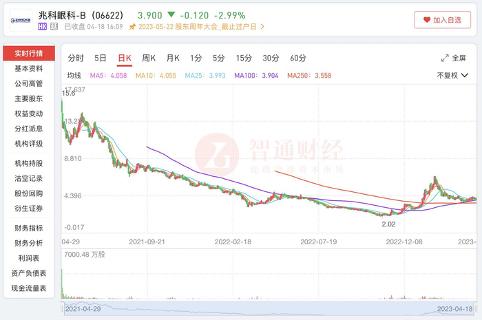 但怎料公司股价“上市即巅峰”,上市当天便破发,此后股价一路走低。去年10月31日,公司股价更是跌至2.02港元,较发行价暴跌87%。随后公司股价虽有所回升,但仍处于历史低位水平。截至2023年4月18日收盘,兆科眼科跌2.99%,收报3.9港元,公司股价仅为上市之时的四分之一。