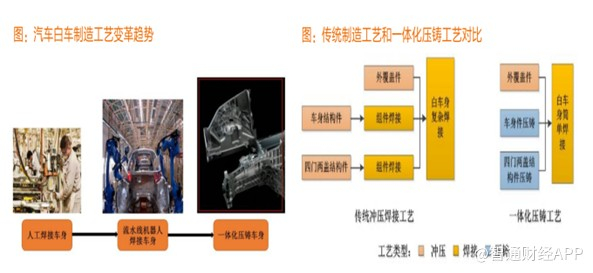 对于新能源车而言,一体化压铸还可以提升续航水平,根据相关研报,燃油车重量降低10%,油耗就能降低6%-8%,而假设新能源汽车重量下降100KG,不仅电池成本和损耗可降低20%,而且续航还能大幅提升10%-11%。