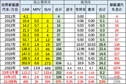 5月2日,全国乘用车市场信息联席会秘书长崔东树发文称,2023年世界新能源汽车走势较稳,2023年1-3月的广义新能源汽车销量370万台,其中混合动力达到109万台,占比30%。剔除普通混动后的世界新能源乘用车走势仍较强。受到高基数和各国补贴政策逐步退出的影响, 2023年世界新能源乘用车走势较强,1-3月新能源乘用车达到255万台,同比增长26%。而1-3月中国新能源乘用车占比世界新能源59%的表现是不错的。2023年中国新能源车出口超强,这也是中国产业链强大,形成强大的国内市场和出口的双增长。