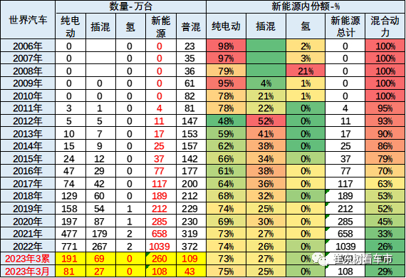 2012年世界广义新能源汽车158万台,到2015年仅有179万台,增长缓慢。随着2016年开始的新能源车加速发展,广义新能源车2016年突破200万台;2017年达到317万台;2018年突破400万台;2020年达到515万台;2021年全年广义新能源车977万台,其中普通混合动力达到319万台;2022年的广义新能源汽车销量1411万台,其中混合动力达到372万台,占比26%。2023年1-3月的广义新能源汽车销量370万台,其中混合动力达到109万台,占比30%。