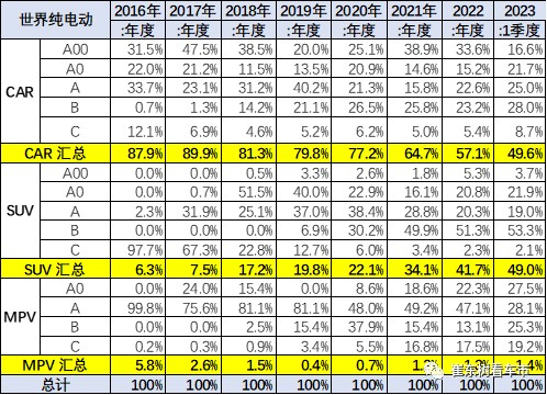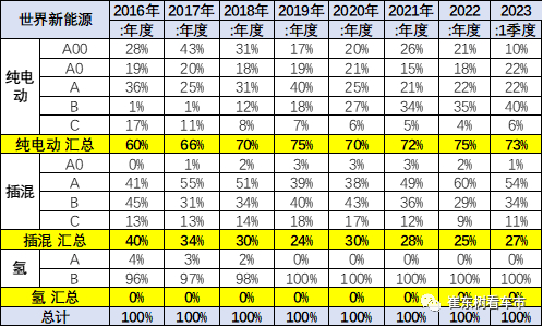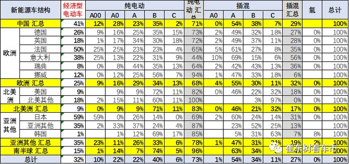 世界B级电动车的占比较高,而A级的占比偏低,这也是特斯拉的世界布局的特色效果。