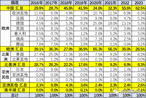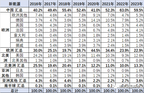 2021年全年的欧洲新能源市场受疫情影响,新能源增长较弱。2022年仍受到疫情影响,欧洲2022年较2021年份额下降较大,2023年欧洲份额小幅上升。