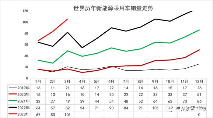 2023年世界新能源乘用车走势较强,1-3月达到255万台,同比增长26%。相对前几年的1-3月走势稍慢。