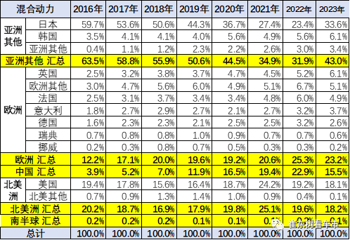 中国近两年混动高速发展,2022年成为世界较大的混动市场,超越美国成为超强主力。2023年中国混动世界份额15.5%,仍较强。