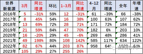 2021年-2022年呈现加速上升态势,低基数下的增长更强。2023年世界新能源车起步较低,3月基本恢复强势高增长。