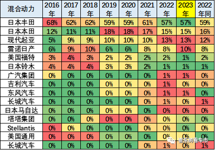 混合动力市场是日韩强势的占据,丰田、本田、日产和现代的混动表现很强,占据93%。其它大部分企业的混动份额均不超过1%。长城在2022年的混动市场份额表现较强,也是产品突破的机遇。