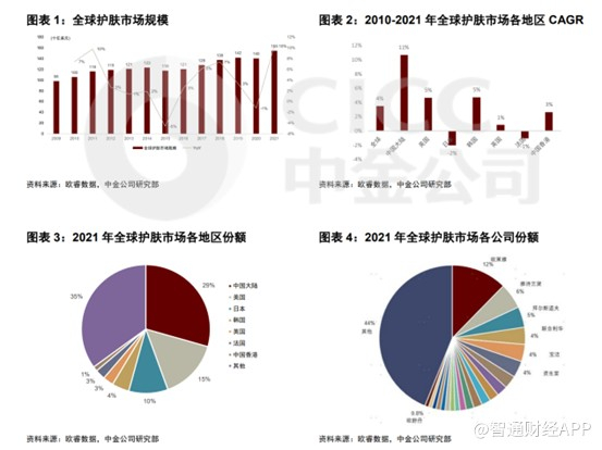 正所谓“爱美之心人皆有之”,在此背景下,全球护肤品市场十分可观。根据欧睿数据,2021年全球护肤市场规模达1550亿美元,2009-2019年CAGR为4%,2020年受疫情影响同比下滑1%,2021年同比增长反弹至 10%。分地区来看,2010-2021年销售额CAGR中国大陆领先11%,2021年占比前三的市场分别为中国大陆29%、美国15%和日本10%。分公司来看,2021年全球护肤市场占比最大的公司为欧莱雅(12%)、雅诗兰黛(6%)、拜尔斯道夫、联合利华、资生堂等,其中欧莱雅、雅诗兰黛为业务遍布全球且旗下拥有较多高端化妆品品牌的公司,其他大多为日化公司(如宝洁)或业务集中在某区域的公司(如资生堂)。