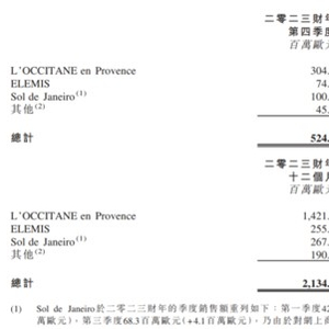 Sol de Janeiro在2023财年跃升至公司的第二大收入品牌,2023财年销售额达到2.67亿欧元,销售增长率达到135.2%,其中第四季度销售额为1亿欧元,同比大增267.5%。Sol de Janeiro品牌销售大增的主要原因为Bum Bum Firmeza护肤油,连同其最畅销的Brazilian Bum Bum Cream及Rio Radiance香水喷雾所带动。