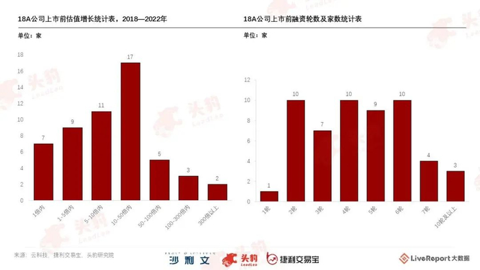 据LiveReport大数据,已上市18A公司普遍在上市前已经进行了较为频繁的融资,上市前融资轮次为2-6轮的有46家,占比85%;上市前融资轮次最多的公司高达12轮;大部分公司的估值较首轮融资增长突出,且过半18A公司的发行估值较最后一轮溢价50%以上。