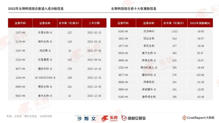 沙利文捷利生物科技综合于2022年新增8只成分股,目前共有56只成分股。截至2022年12月31日,生物科技综合指数的成分股合计市值约7000亿港元,前十大权重股合计约4700亿港元,占比约七成;其中,市值前三的成分股百济神州、君实生物、信达生物均已实现摘B。