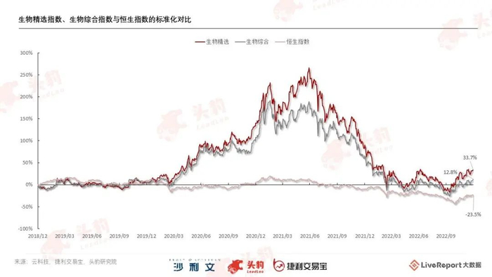 自2018年12月31日至2022年12月31日,生物精选指数录得累计收益率33.7%,生物综合指数录得累计收益率12.8%,同期恒生指数录得亏损,累计收益率为-23.5%。可见,港股18A经历过探索期、狂热期、调整期之后,整体市场表现仍然强于大盘。