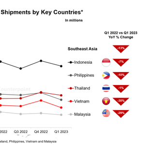 2023年第一季度,所有主要东南亚国家的智能手机出货量均有所下降,但表现参差。越南等国家在2022年第四季度的出货量相对较多,因此各手机品牌厂商有意放缓其在2023年第一季度的出货量。另外,越南的消费者信心尚未完全恢复。三星产量下降10%、智能手机需求在2022年第四季度后适逢淡季、手机品牌厂商和运营商营收减少等因素也是影响因素之一。随着2023年3月需求开始回升,印度尼西亚和泰国的表现相对优于其他国家。