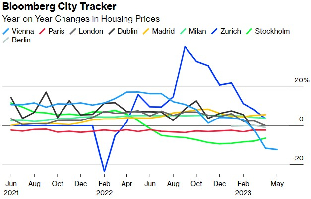 Bloomberg City Tracker首期报告显示,奥地利首都维也纳成为欧洲主要首都中房地产市场最疲软的城市,其房价跌幅达到两位数,甚至超过了遭受重创的瑞典首都斯德哥尔摩。彭博收集的数据,维也纳房价比一年前的峰值下降了12.2%,斯德哥尔摩房价下降了6.4%。相比之下,马德里、米兰和苏黎世等首都城市的房价有所上涨。