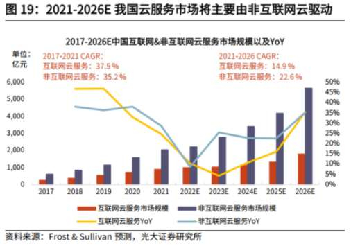 据Frost & Sullivan预测,2026年我国非互联网云服务市场规模有望达到5656亿元人民币,为互联网云服务市场规模的3倍以上。