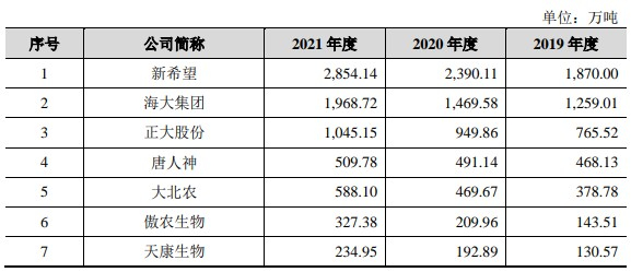 公司作为饲料行业的代表性企业,在我国饲料工业发展历史中做出了较大的引领贡献。经过多年的稳健发展,公司在全国 29 个省、市、自治区拥有现代化饲料公司 87 家,通过饲料生产工业基地化的布局,形成了深度覆盖全国各地的生产经营网络。公司饲料业务已形成了成熟且稳定的采购、生产和销售模式,2019 年至 2021 年度,公司饲料产量分别为 765.52 万吨、949.86 万吨、1,045.15 万吨, 2022 年 1-6 月饲料产量达 509.92 万吨。