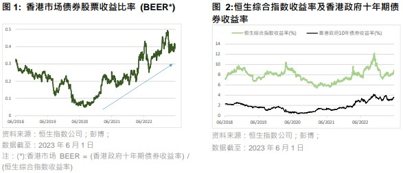 实际上,由于股票投资涉及风险溢价,BEER会小于1.0。但鉴于利率上升,该宏观指标的走势或趋势或能为了解最新股市动态提供一个互补的角度。在过去五年,香港市场的BEER(图1)在2020年年中跌至0.05,但截至2023年6月1日逐渐回升至疫情前的水平,并最终达到0.40(按3.51%除以8.88%计算),低于临界值1.0及美国市场BEER的0.73。从跨资产角度来看,这一上升趋势意味着对比债券收益率,港股估值正逐渐改善,但理论上仍处于被低估的区间。
