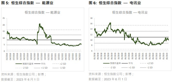 恒指公司表示,香港股市目前的估值为预期市盈率的9.2倍,低于5年平均的1倍标准差(图3)。2023年初至今(截至2023年6月1日),港股中表现最好的行业为电讯和能源业,分别上涨19%和17%(图4)。值得留意的是,该两个行业的估值仍低于5年平均值,能源业(图5)及电讯业(图6)的估值分别为预期市盈率的5.2倍及9.9倍。