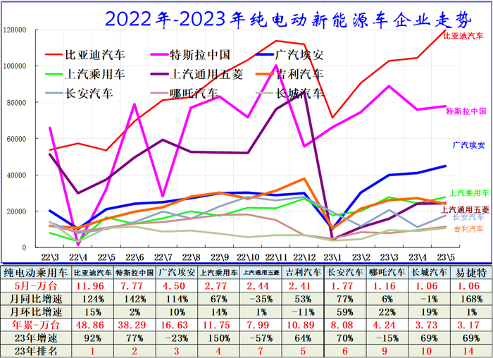 近几年以来纯电动乘用车市场仍然是比亚迪、特斯拉和传统自主品牌为主的格局。5月新能源乘用车市场多元化发力,大集团新能源表现分化。5月纯电动车企表现强的是比亚迪、特斯拉、广汽埃安呈现强势增长,拉动5月总体较强;而吉利汽车和上汽广汽乘用车等的走势也很好;长安新能源5月销量较好;蔚来等新势力的总体走势较好;广汽埃安超越小鹏汽车较大,哪吒表现较好。