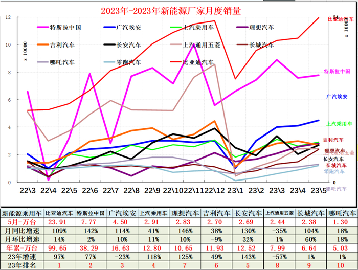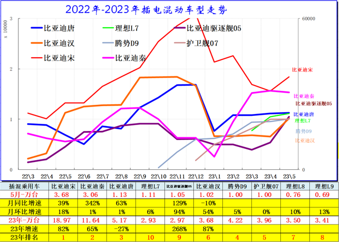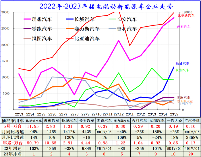 2023年5月份插电混动市场走势分化,主要的厂家是比亚迪处于绝对领先,比亚迪由于销量较高,放到右轴。理想汽车、长城、长安汽车、吉利汽车等跟进比亚迪发展插混,但差距较大。近期吉利和长城新品的插混产品很有竞争力。