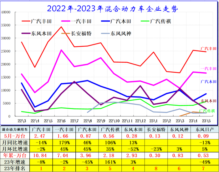 2023年混合动力车型还是日系4家的表现相对较强,丰田和本田两个品牌为绝对主体,其中丰田表现优秀,广汽丰田品牌表现相对较强,综合的总量相对均衡,体现在两家的相对走势平稳。