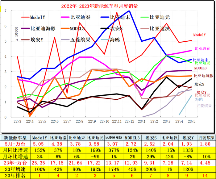 5月纯电动车型表现相对较强的是特斯拉MODEL Y、比亚迪元、海豚、MODEL3、埃安等产品。