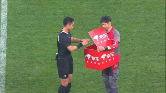 一名身穿经典京东工服的京东小哥,带着一个标有显眼京东logo的箱子走进场内,为主裁判送上比赛用球。