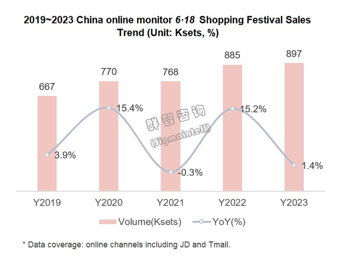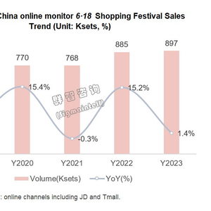 6月21日,群智咨询数据显示,在2023年的“6·18”期间(5.31~6.18),中国独立显示器线上市场销售规模约为90万台,同比增长约1.4%。考虑到需求疲软、2022年高基数以及23Q1中国显示器零售市场“价格战”提前等因素的影响,今年“6·18”市场的增长来之不易。群智咨询表示,上半年全球显示器整机出货形势艰难,同比降幅预计达17%。