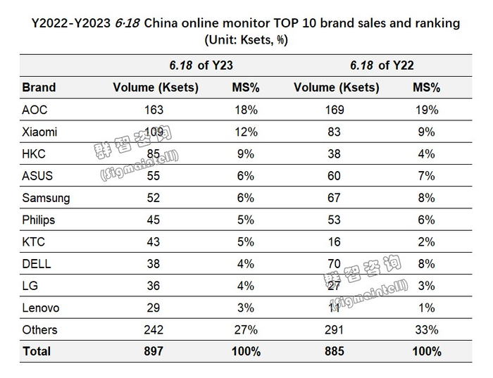 华硕(ASUS):受高端需求疲软以及电竞显示器品类价格竞争激烈的影响,华硕今年销量约5.5万台,同比小幅收缩。