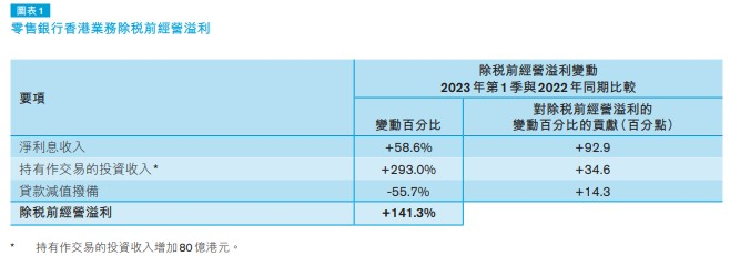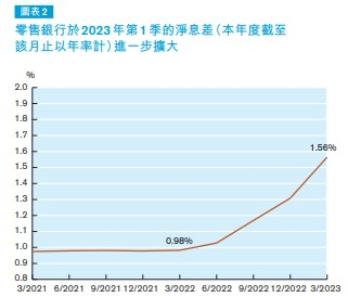 6月29日,香港金管局刊发最新一期季报。银行业表现方面,香港银行体系维持稳健。香港银行继续保持充足资本及流动性缓冲。尽管特定分类贷款比率上升,但银行体系的资产质素维持健康。数据显示,零售银行整体除税前经营溢利在2023年第1季按年增加141.3%,盈利改善主要是由于净利息收入及持有作交易的投资收入增加,以及贷款减值拨备减少。在加息环境下,零售银行净息差在2023年第1季扩大至1.56%,去年同期则为0.98%。