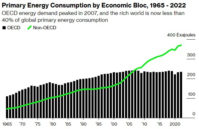 全球能源需求正在增加,但就经济而言,这是一个分裂的景象。对于OECD的高收入和中等收入经济体来说,一次能源需求在15年前达到峰值——恰好在同一年,世界其他地区的需求超过了OECD。自2007年以来,OCED国家的需求绝对值实际上下降了3.4%,而同期世界其他国家的需求几乎有增无减。