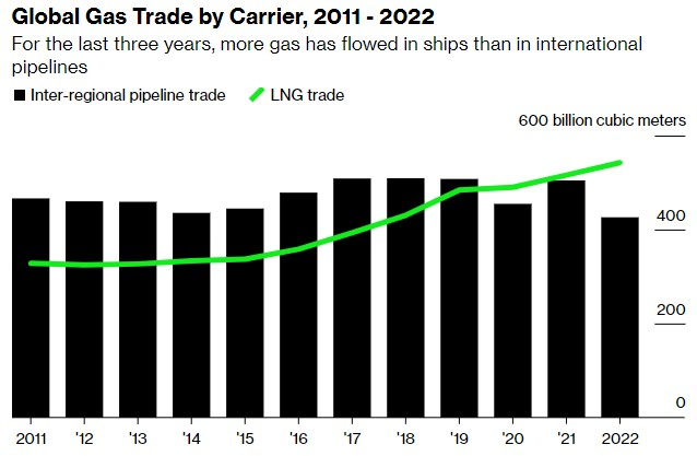 几十年来,天然气主要通过管道和海运液化天然气运输。多年来,管道运输一直是区域间天然气贸易的主要推动力,但自2020年以来,液化天然气在区域间贸易总量中占据了主导地位。考虑到俄乌战争和俄罗斯对乌克兰管道出口的限制,以及目前由美国主导的液化天然气贸易的蓬勃发展,这一趋势可能会持续数年。